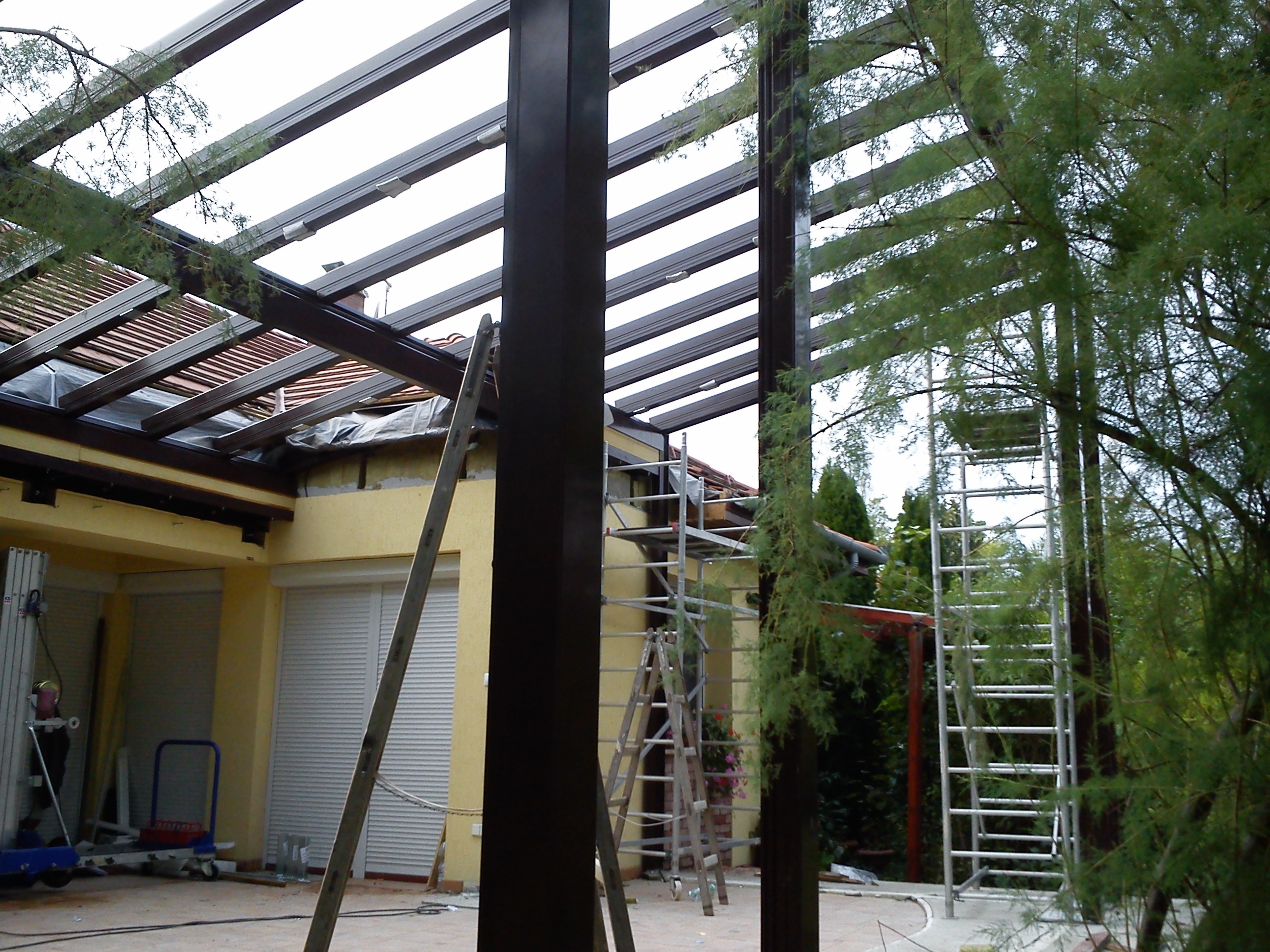 Felújítások során gyakran előfordulhat, hogy például a kialakítandó üvegtetőnek, a megszokottal szemben, éppen az épület felé kell dőlnie, és esetleg a homlokzat még vissza is van léptetve. Az eset rendhagyó, de korántsem szokatlan, hiszen ilyenkor jogosan merülnek fel a kételyek az összefolyó esővíz, kondenzvíz elvezetése, a hó zug elkerülése, a hőszigetelt, páramentes falcsatlakozás, és a falazat/födémkoszorú terhelésének elosztása kapcsán. A Solarlux télikerttel azonban a tető standard csatlakozásait kiegészítve végigfutó tehermegosztó acél konzolokkal, a falazat csatlakozásánál kialakított épített vápa kialakítással minden csapadékot megfelelően el lehet vezetni. A vápa megfelelő lejtése belső lejtésképzéssel megoldható, majd PVC és utána bádogfedéssel biztosítható a sértetlensége. Amikor a tető többféle dőlésszögben találkozik az üvegtetővel, a vápa mélységével kompenzálható a víz mozgási energiája. A kialakult belső sarokban a feltorlódó hó olvadását érdemes nem csak az üvegtető intenzívebb hősugárzásával, hanem vápafűtéssel is elősegíteni.