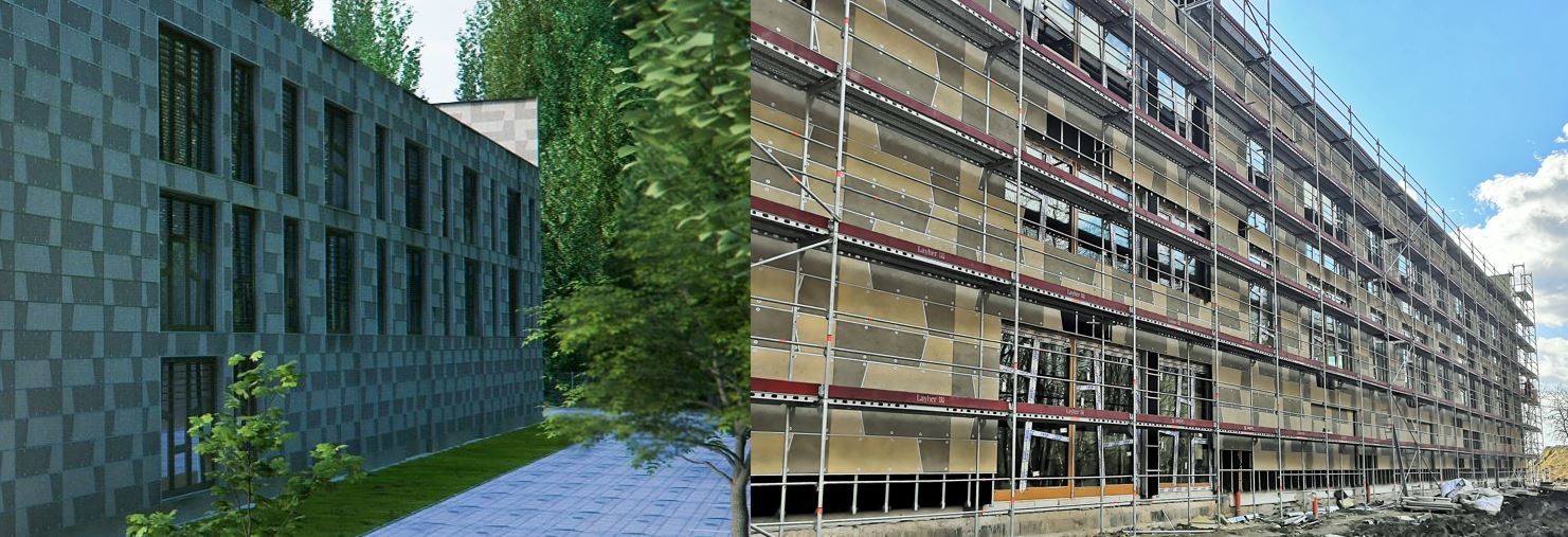 A tervező – látva a Heraklith lapokban rejlő lehetőségeket – a Knauf Insulation Kft. mérnökeinek együttműködésével egy merőben új, a megszokottól eltérő homlokzatkialakítást választott. A merész kezdeményezés során a szerelt jellegű homlokzatszigetelést a fagyapot lapok kötőanyagának - fehér és szürke cement - megfelelő fedőfestékkel bevont Heraklith táblákkal zárta le.