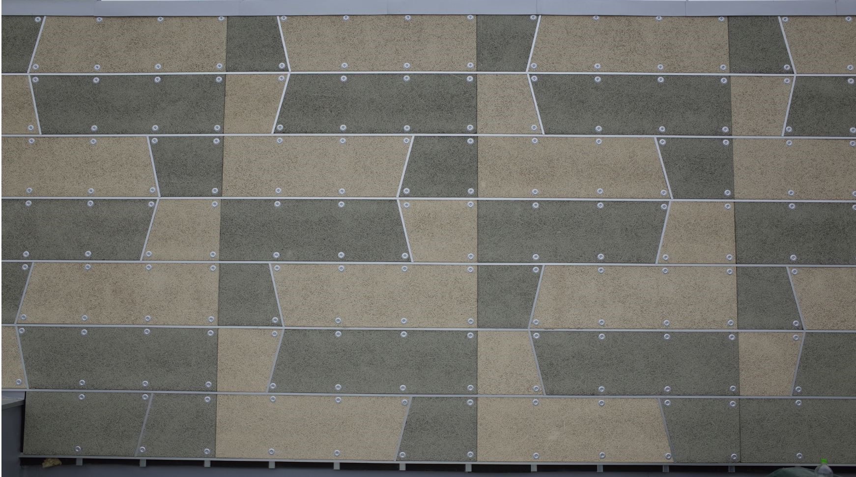 Az épületre a Knauf Insulation Kft a tervezői elvárásoknak megfelelő egyedi lapokat gyártott. A nem éghető, 25 mm vastag fehér cementtel – Heraklith A2 25x500x2000 mm -, valamint a szintén nem éghető szürke cementtel – Heraklith A2 C 25x500x2000 mm – készült lapok megnövelt testsűrűséggel kerültek legyártásra. Az élképzett, gyalult lapokat Sto Kft. Hydrogrund alapozójával kezeltük és a lap színének megfelelő Sto Color Lotusan festékkel festettük le.