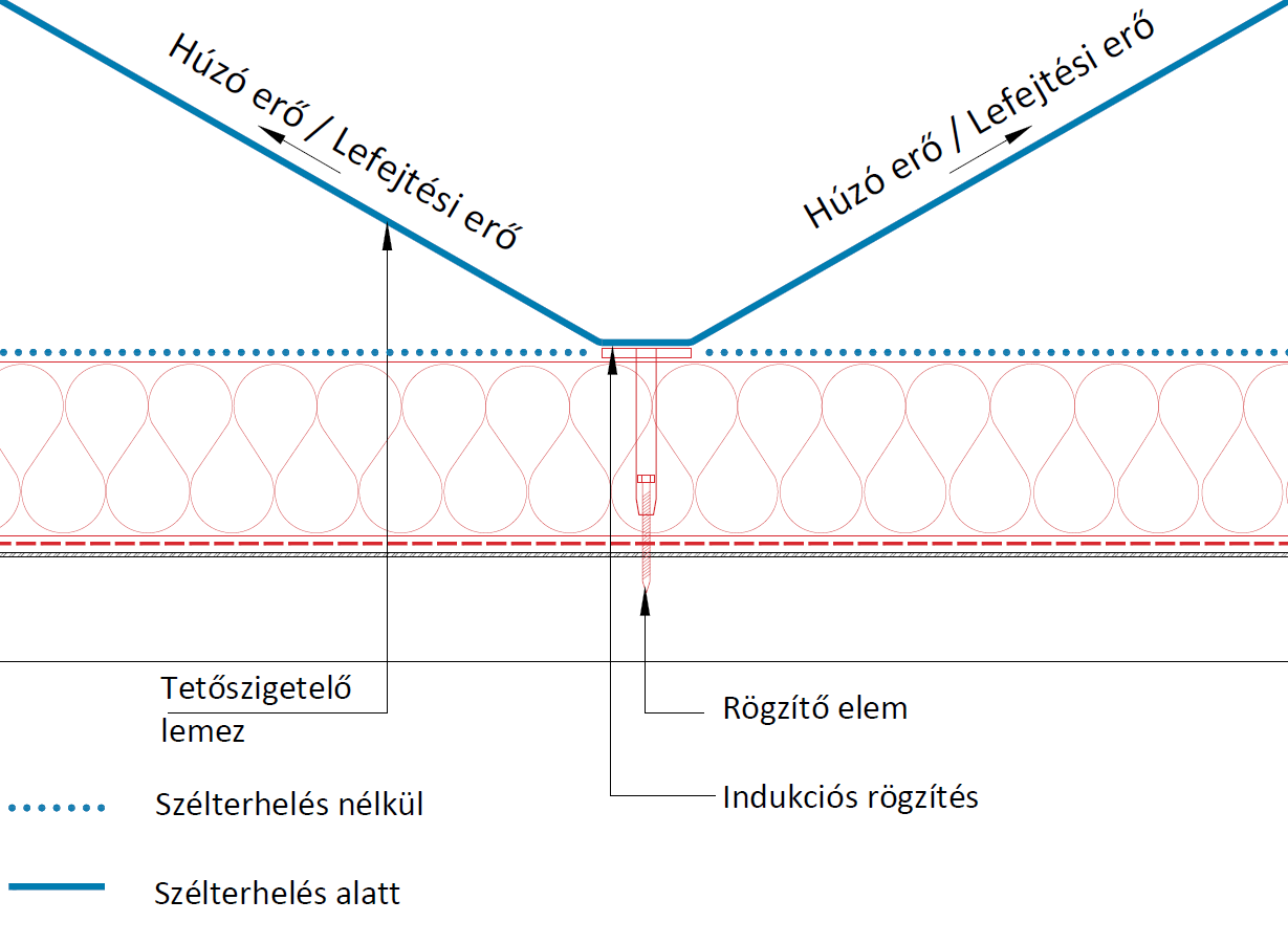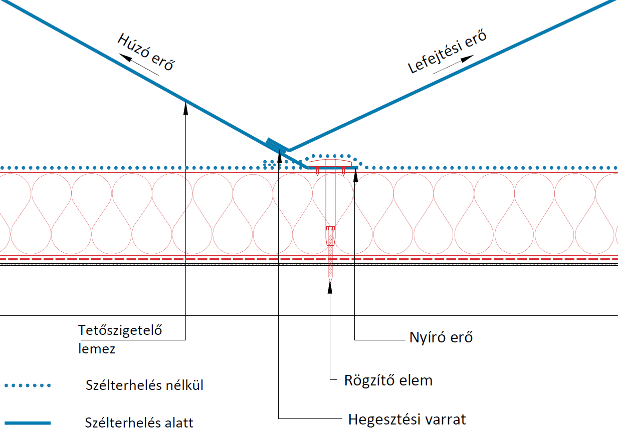 Az átlapolás alatti rögzítés során a rögzítő-elem körül a szigetelőlemezt a húzó és a lefejtési erő ugyanazon irányból érik, vagyis csak egy irányból húzódik a lemez, ezáltal a rögzítési pontokban a rögzítő-elemekre oldalirányból nemkívánatos nyíróerő is hat.