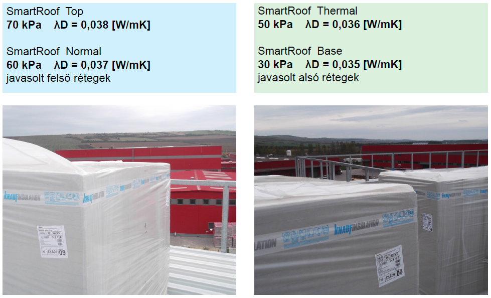 Példaként: SmartRoof Base 15 cm és SmartRoof Normal 6 cm alkalmazásával az U értékét sikerült volna 0,17 [W/m2K] alá szorítani. Javaslatunk szerint általában célszerű alsó rétegként vastagabb, jobb hővezetéssel rendelkező anyagot beépíteni. A SmartRoof Base mechanikai tulajdonságainak köszönhetően mindemellett bőven ellenáll a kivitelezés során keletkező fizikai behatásoknak.