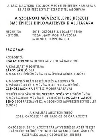 Megnyitó: 2015.10.03. 15:00 Helyszín: TISZA(p)ART Mozi kávézója (Szolnok, Tmeplom u. 4.)