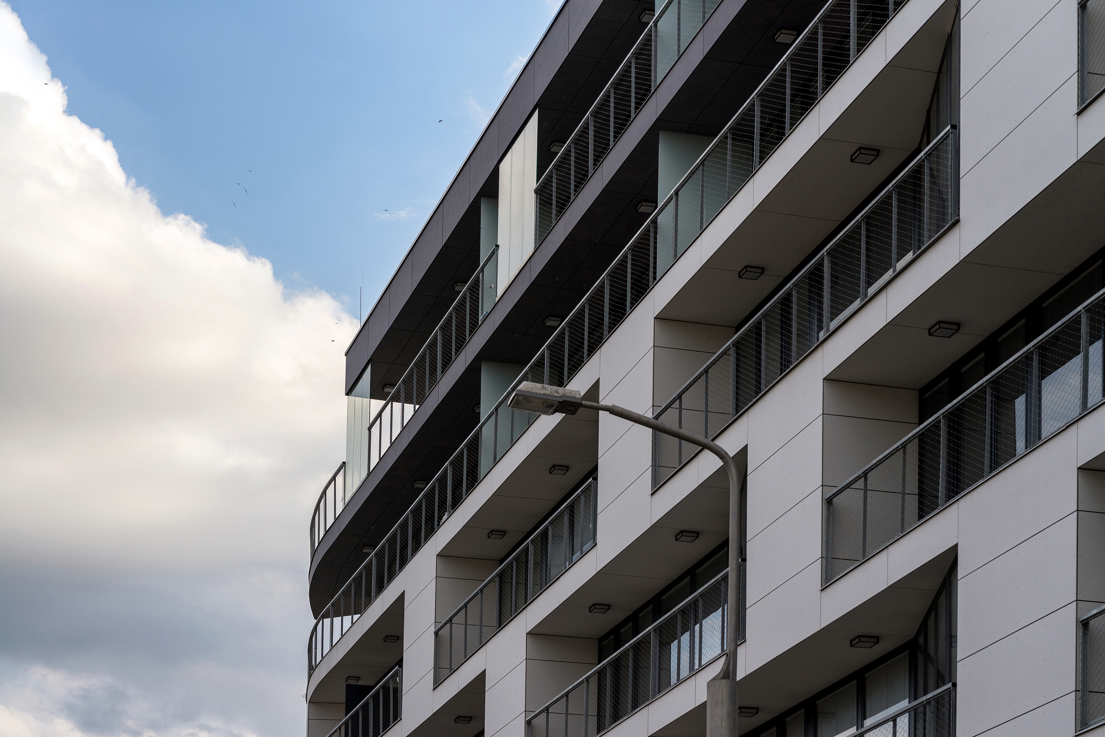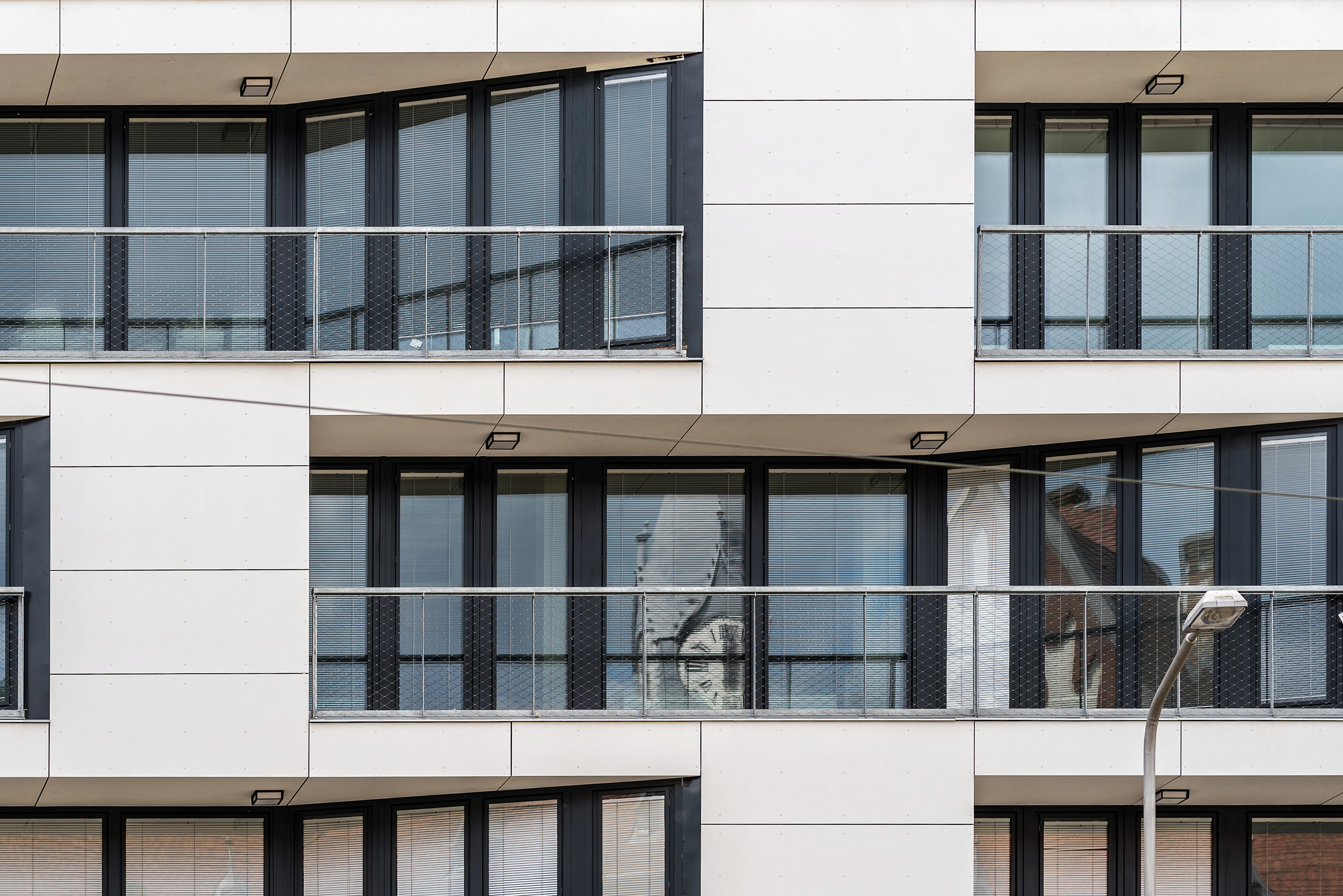 „Az utcai homlokzat homogén és anyagszerű megjelenése miatt fehér, szálcement táblás burkolást kapott. A professzionális szerelhetőség lehetősége, a precíz síktartás, az egyszerű karbantarthatóság és a tisztíthatóság okán EQUITONE [tectiva] táblák kerültek beépítésre.” – indokolta az anyagválasztást Bordás Péter.  A főhomlokzatot süllyesztett teraszok tagolják, soronként eltolt ritmusban. A teraszokban megjelenő megtört üvegfelületek tükrözik a környező épületek architektúráját, mint „monitorok”. Ez a koncepció hozza létre a homlokzaton észlelhető jellegzetes hullámzó mozgást. A legfelső két lakószint új ráépítés, amelynek lelépcsőző tömege könnyed átmenetet teremt a különböző magasságú szomszédos épületek között. Ezen két szint nemcsak tömegében, de burkolatában is különbözik, elegáns, sötétszürke, EQUITONE [tectiva] borítást kapott. Az EQUITONE [tectiva] anyagában színezett homlokzatburkoló anyag, amelyet egyedülálló, finom metszésű felület és természetes árnyalat eltérések jellemeznek. A lapok tetszés szerint bármilyen formájúra alakíthatók. Minden panel egyedi, erőteljesen kiemelve a szálcement anyag nyert belső textúráját.