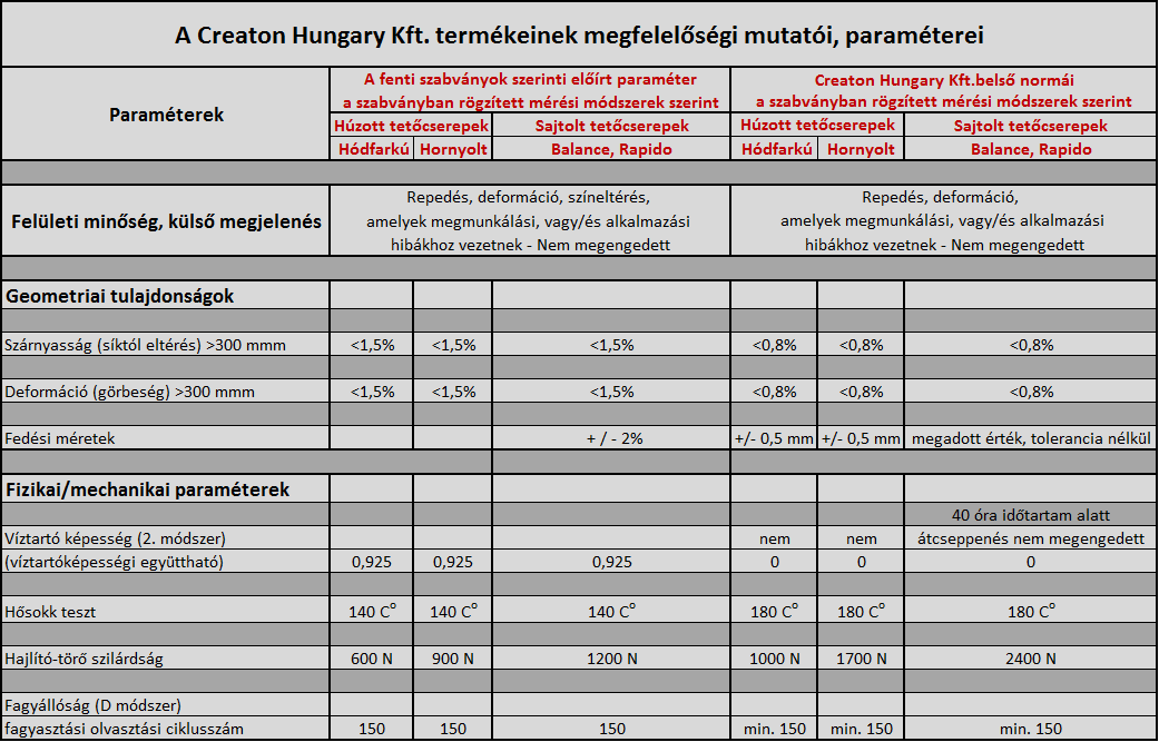 A Creaton South-East Europe Kft. termékeivel szemben elvárt és garantált műszaki teljesítménymutatóit, összehasonlítva azokat előírások szerinti paraméterekkel, az alábbi táblázat foglalja össze.