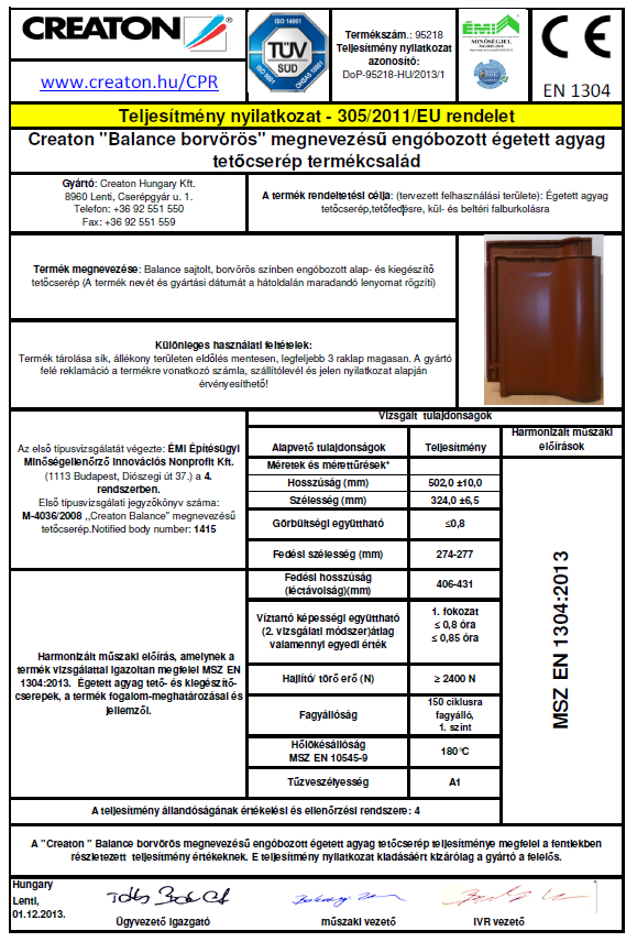 A Creaton kerámia tetőcserepek lényeges műszaki teljesítmény mutatóit minden egyes termék esetén teljesítmény nyilatkozat formájában adja közre (egyenként 8 nyelven). Ezek a nyilatkozatok a www.creaton.hu >> szakembereknek >> Telj. nyilatkozat  oldalon érhetőek el.