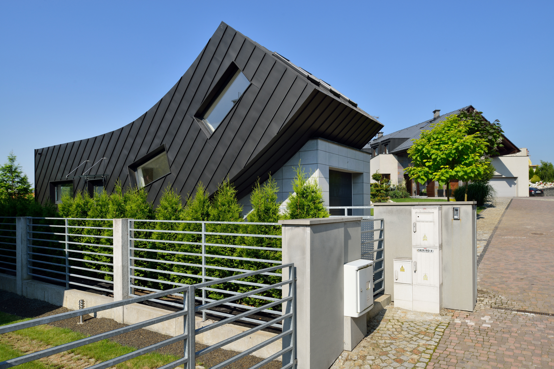 Nem volt kérdéses a tetőablak beépítése az említett krakkói, fémlemezzel borított absztrakt építészeti műalkotásnál, a DomoDom-nál sem. A garázsból továbbgondolt merész formájú vendégház tervezése során szempont volt az épület belsejébe jutó fény mennyisége, és persze az épületburokhoz színben és energetikai mutatóiban igazodó ablakot kellett találni. Ennek megfelelően a tető központi lejtős részére választott Roto Designo tetőtéri ablakok antracit színű borítólemezei színben és formában követik az építészetben uralkodó mai trendeket, és kiválóan illeszkednek az épület külső megjelenést jellemző titáncink lemez borításhoz.