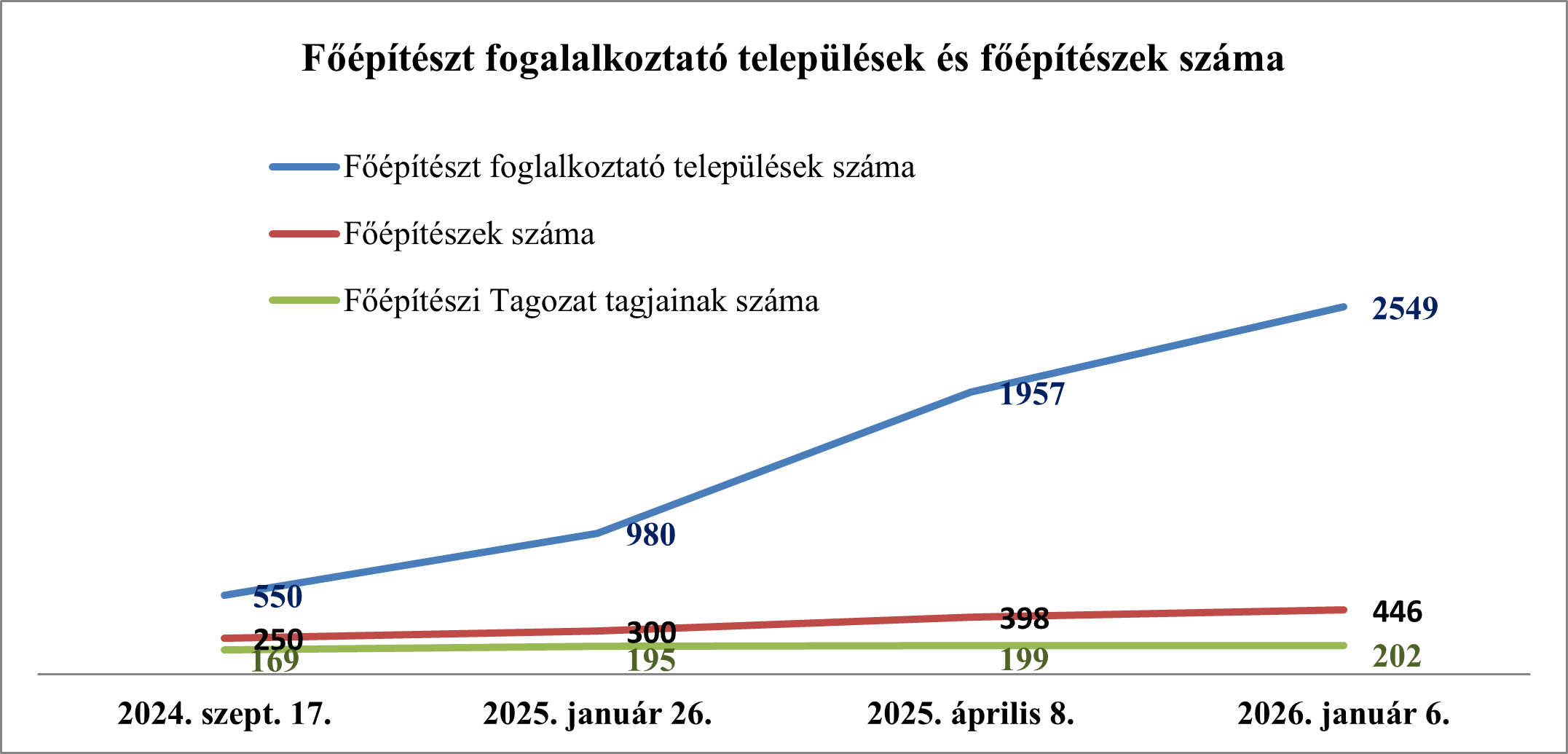 A főépítészt foglalkoztató települések számának jelentős növekedésével szemben, a főépítészek száma sokkal kisebb arányban növekedett. Mindez azt jelenti, hogy a gyakorló főépítészek egyre több településen látnak el főépítészi feladatokat.